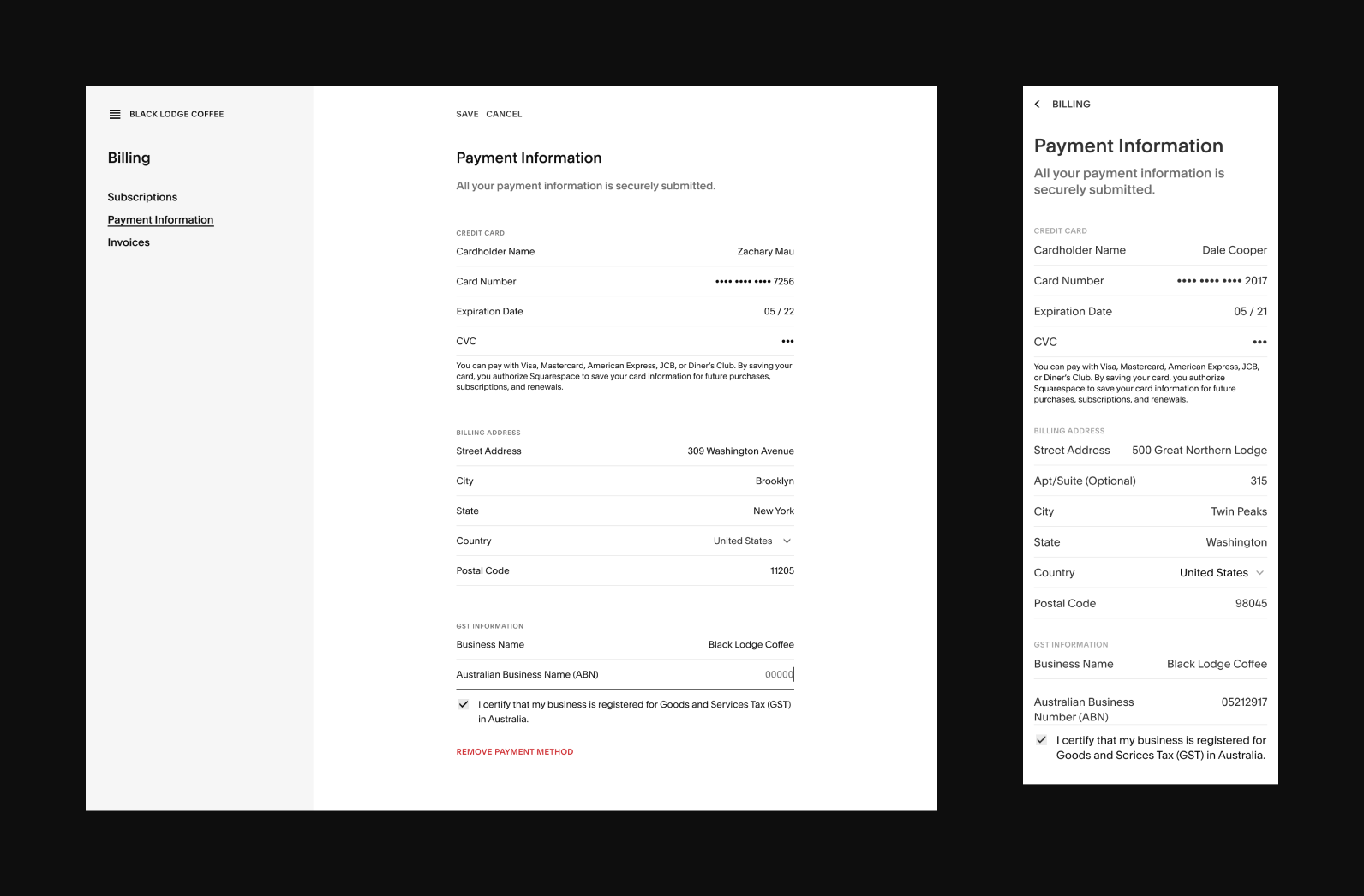 The payment experience not only had to support simple functions like editing and removing credit cards, but also more complicated financial services like ABN, VAT, GST, SEPA, and IBAN.